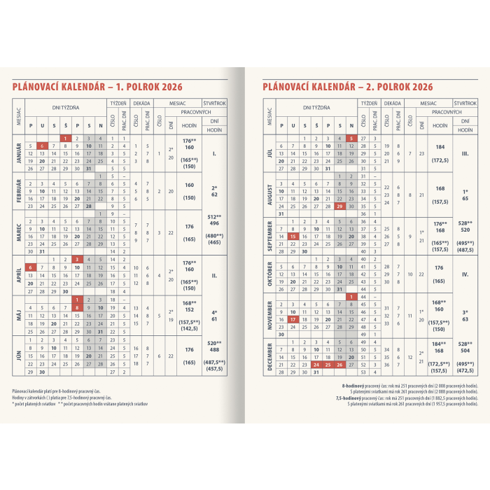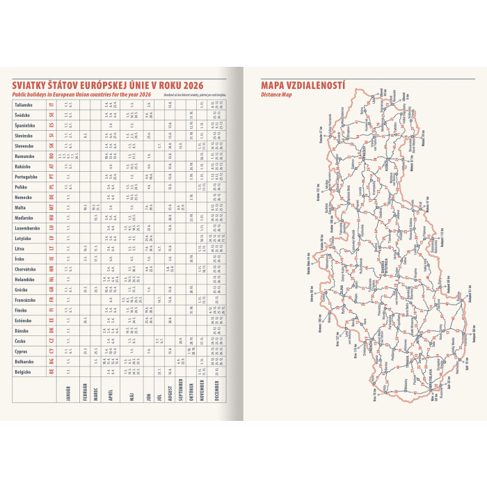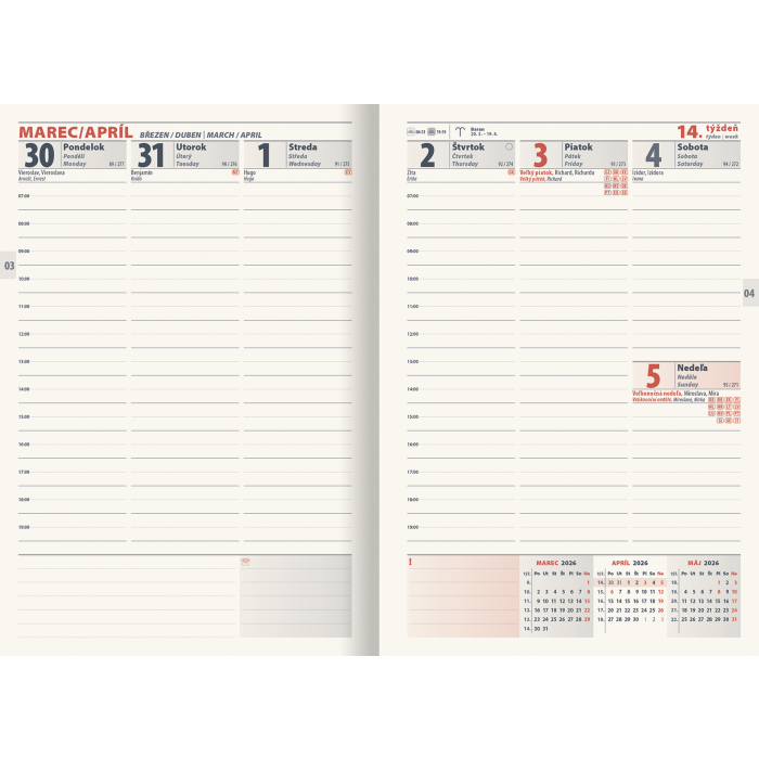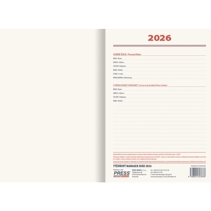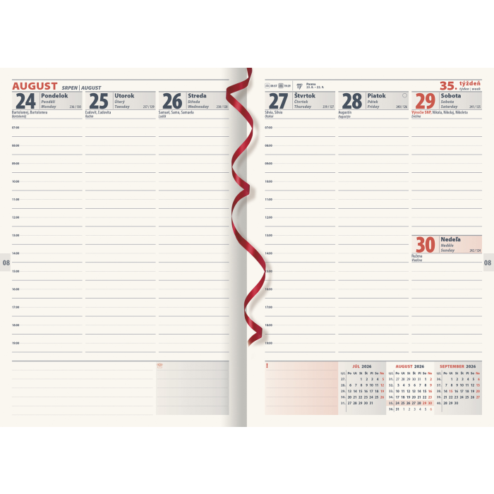 Týždenný diár s listami z krémového papiera vo fomráte B5 s hodinovým delením (7:00 - 19:00) obsahuje slovenské a české kalendárium, anglický preklad mesiacov a dní, informácie o štátnych sviatkoch všetkých krajín EÚ, prehľadný a plánovací kalendár (fond pracovného času), školské prázdniny, prehľad slovenských EČV, adresár. Ponúka dostatočný priestor pre písanie poznámok a pripomienok.