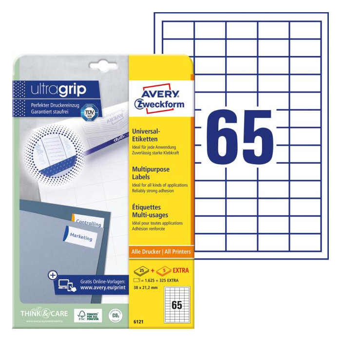 Biele univerzálne etikety vhodné na každodenné použitie v atramentových a laserových tlačiarňach a kopírovacích strojoch. Vďaka inovatívnej technológie ultragrip sa môžete spoľahnúť na bezchybné natiahnutie archu a tlač bez zasekávania. Bezpečnostný okraj QCT zabraňuje zanášaniu tlačiarne lepidlom. Pre laserové tlačiarne testované