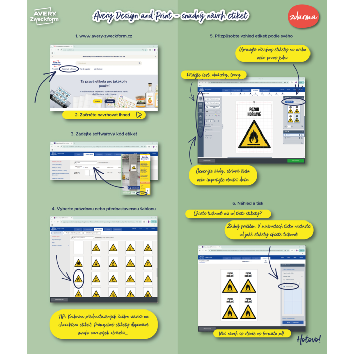 a certifi kované TÜV SÜD. Vysoká lepivosť na rôznych povrchoch. Ostrá tlač bez bez rozmazávania. Etikety sú vyrobené spôsobom šetrným k životnému prostrediu, majú certifi káciu FSC®, sú bielené bez použitia chlóru. Šablóny a softvér pre jednoduchú a rýchlu tlač etikiet k dispozícii zdarma. Formát A4. Balenie 25 + 5 hárkov.