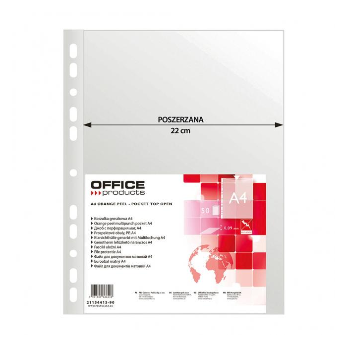 Obaly s eurodierovaním vhodné na zakladanie materiálov rozšíreného formátu A4. Povrch matný. Otvor zhora. Vnútorné rozmery obalu 304 × 220 mm. Balené v sáčku. Hrúbka 90 mic. Balenie 50 ks.
