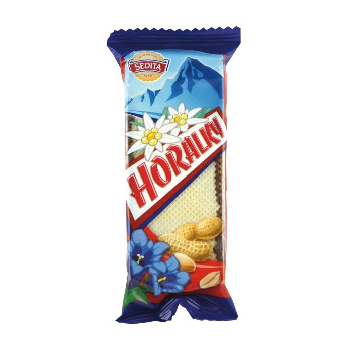 Obvodovo máčané oblátky v kakaovej poleve s arašidovou krémovou náplňou (72%). Hmotnosť 50 g. Väčšie balenie 56 ks.