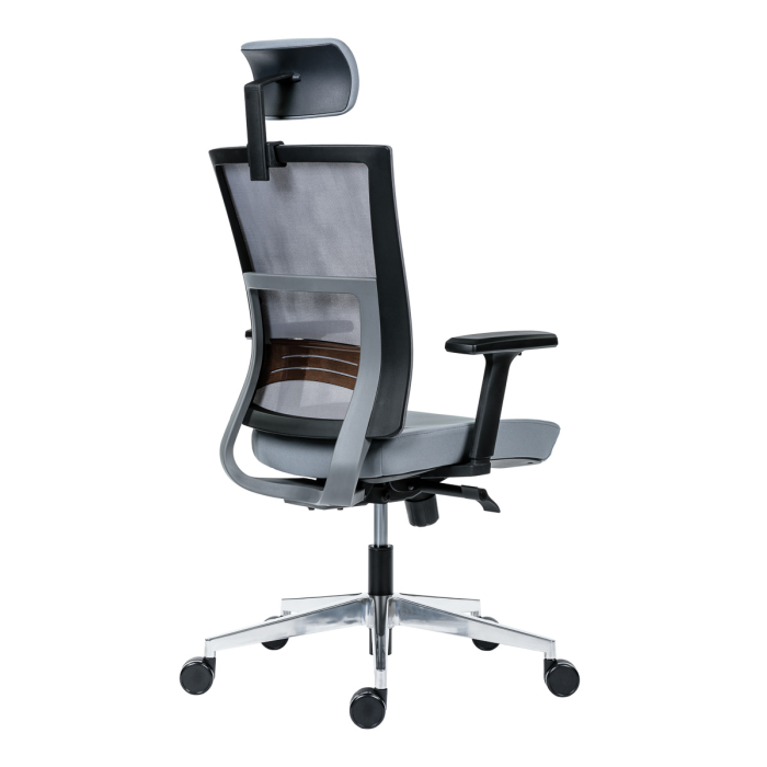 • kancelárska stolička s vysokým priedušným operadlom, opierkou hlavy, podrúčkami a molitánom sedáku zo studenej peny, synchrónny mechanizmus s nastavením sily protiváhy