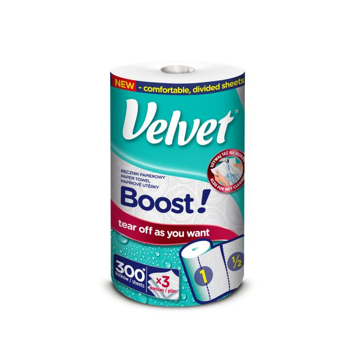 Tri vrstvy mimoriadne pevné a skvele savé buničiny, to sú papierové utierky Velvet Boost! . Vďaka nim sa dokonale osvedčí pri prácach vykonávaných nasucho aj namokro. Maxi veľkosť jednotlivých útržkov zaručí, že utierka je mimoriadne savá, zvládne aj ten najväčší neporiadok a dlhšie vydrží. Vďaka príhodnej veľkosti rolky sa výrobok zmestí do každej, aj tej najmenšej kuchyne. 3 vrstvy, 300 útržkov, 100% celulóza