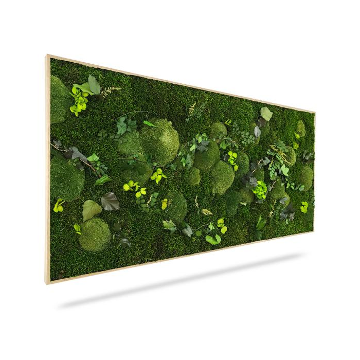 Machový obraz RASTLINY Mesia je tvorený kombináciou machov v zelených odtieňoch so stabilizovanými rastlinami, ktoré jemne dotvárajú prirodzený prírodný dizajn bez rušivých prvkov.
