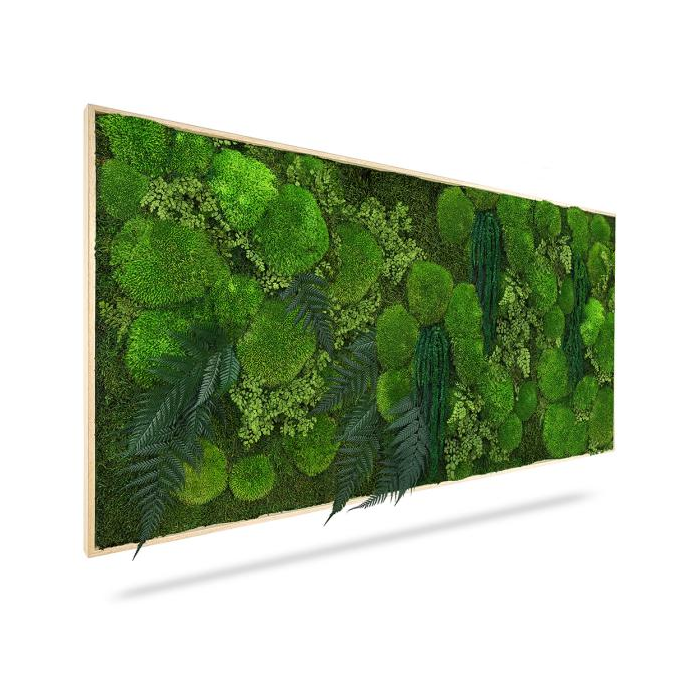 Machový obraz RASTLINY Moreilo je tvorený kombináciou machov v zelených odtieňoch so stabilizovanými rastlinami, ktoré jemne dotvárajú prirodzený prírodný dizajn s 3D efektom vystúpených rastlín.