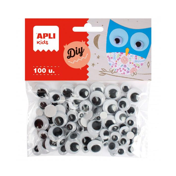 Čierne okrúhle nalepovacie krútiace oči. Rôzne veľkosti*: Ø 7 mm, Ø 10 mm, Ø 12 mm a Ø 15 mm. Každé vrecúško obsahuje 100 očí. Oči s lepidlom na zadnej strane, pripravené na použitie. Vysoká priľnavosť na rôzne povrchy: papier, kartón, pena EVA, plast, keramika alebo sklo. Základný produkt do škôl a detských dielní, ideálny na tvorbu kostýmov, na zdobenie alebo na akúkoľvek inú ručnú prácu.