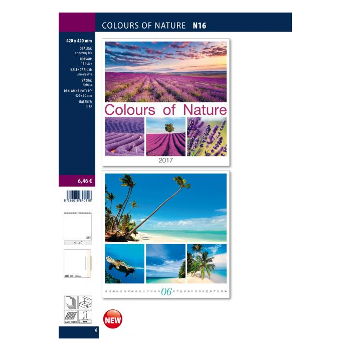 Rozmer: 420 x 420 mm. Obálka : disperzný lak. Rozsah: 14 listov. Kalendárium: univerzálne. Väzba: špirála. Balenie: 10 kusov.