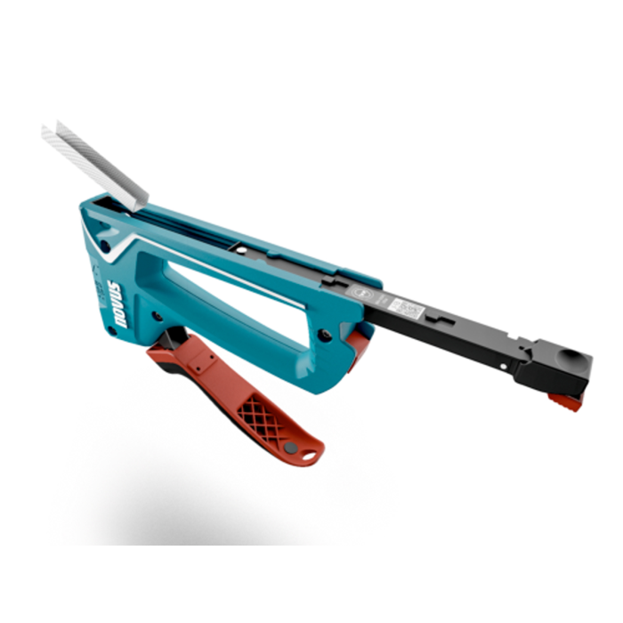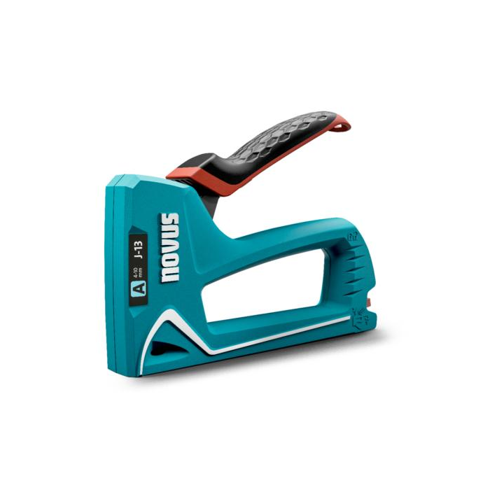 Malá ručná nastreľovačka s vysokokvalitným plastovým krytom na univerzálne použitie, napr. na rýchle napnutie tkaniny do rámu. Spodný plniaci zásobník s bezpečnostnou poistkou na ľahké plnenie spinkami, zámok rukoväte pre skladovanie, kontrolné okienko na sledovanie stavu naplnenia zásobníka. Kapacita: (A) spinky 140 ks.