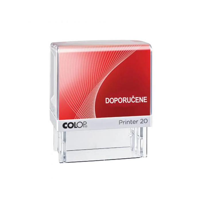Samofarbiace pečiatky s hotovým textom: DOPORUČENE. Veľkosť odtlačku 14 × 38 mm. Farba odtlačku červená. Náhradná poduška E/20 červená. Počet riadkov textu : 1.