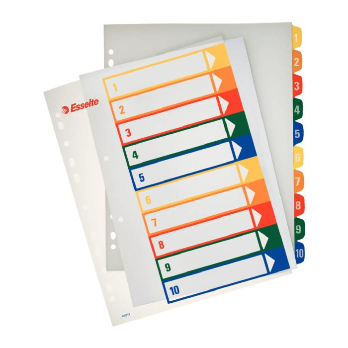 Farebný rozraďovač vyrobený zo zosilneného plastu s eurodierovaním. Titulný list možno vytlačiť v dopredu pripravenom formáte A4. Predloha zdarma na: www.esselte.com/-projectsystem. Výsledný dokument pôsobí upravene a reprezentatívne. Balenie jedna sada v polyesterovom sáčku. Väčšie balenie 10 sád. Farba: 10 farieb Formát: A4 maxi Súčasťou: potlačiteľný titulný list