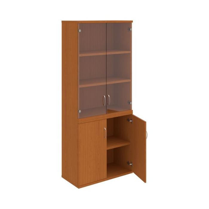 Kombinovaná skriňa - dvere/nika. Kancelárske skrine STRONG majú robustnú konštrukciu a vyššiu nosnosť políc ako bežné kancelárske skrine.V ponuke sú skriňové moduly s výškou 185 cm, 111 cm alebo 74 cm a šírky 80 cm alebo 40 cm. Hĺbka všetkých modelov skriňového radu STRONG je 40 cm.Chrbát, vyrobený z 8 mm hrubých dosák, je obojstranne pohľadový, takže skrine môžete použiť ako priestorový deliaci prvok. Hrúbka samotných políc je 25 mm, čo znamená nosnosť 80 kg na 1 policu.Korpusy, dvierka a police skríň sú olepené odolnou 2mm ABS hranou, ktorá garantuje dostatočnú ochranu proti poškodeniu.