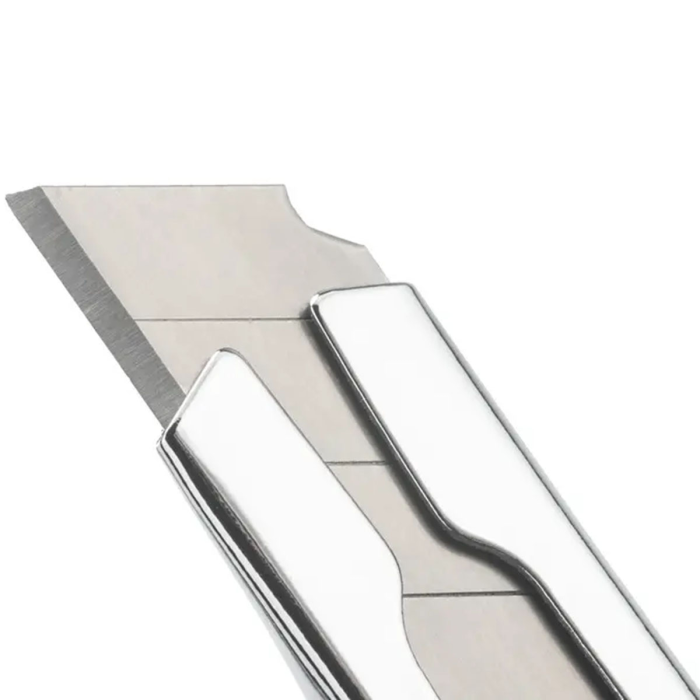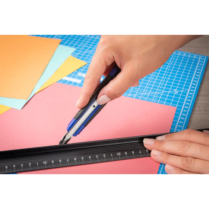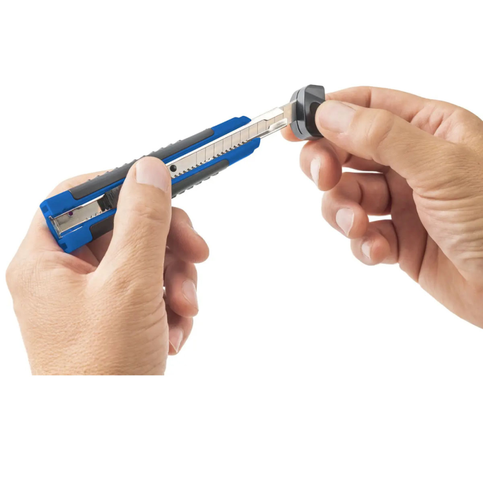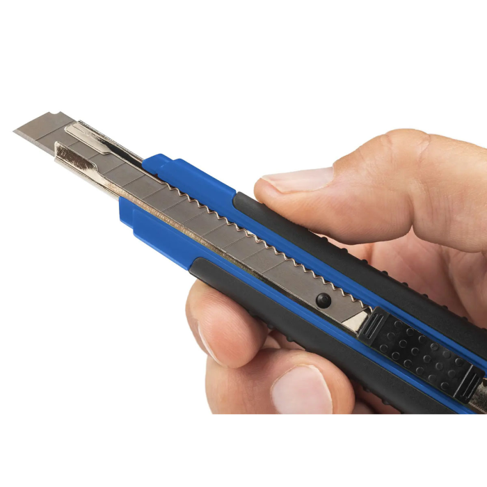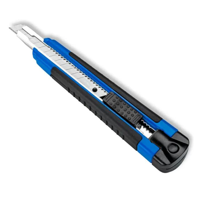 Protišmykový univerzálny rezač na rýchle a ostré rezy s odlamovacím nožom, kovovou čepeľou a aretáciou. Profi model stredný so šírkou čepele 9 mm má nôž rozdelený na 12 častí. Vďaka integrovanej funkcii odlamovania čepele v rukoväti budete mať vždy ostrú čepeľ. Rezač perfektne a bezpečne padne do ruky vďaka ergonomicky tvarovanej gumenej rukovätiModel je dodávaný s 1 nožom a s 2 náhradnými čepeľami navyše. Farba modrá. Čepeľ: odlamovacia čepeľ Šírka čepele: 9 mm Náhradná čepeľ: 2 náhradné čepele Materiál puzdra: ABS plast