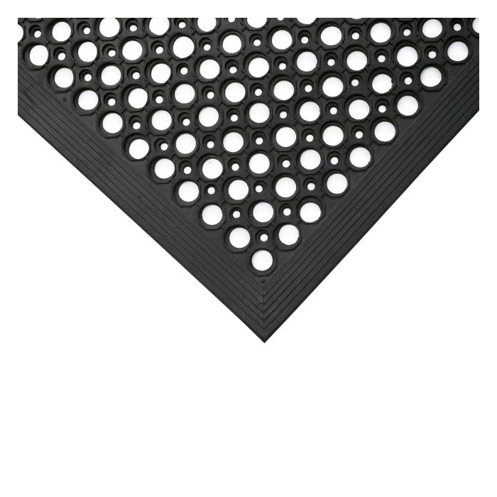 Protiúnavová exteriérová rohož vyrobená z oteruvzdornej pryže. Zvýšený kruhový povrch s otvormi poskytuje vynikajúcu protišmykovú ochranu, skosená hrana znižuje riziko zakopnutia. Výška rohože 14 mm. Rohož vyhovuje slovenským normám a nariadeniam.