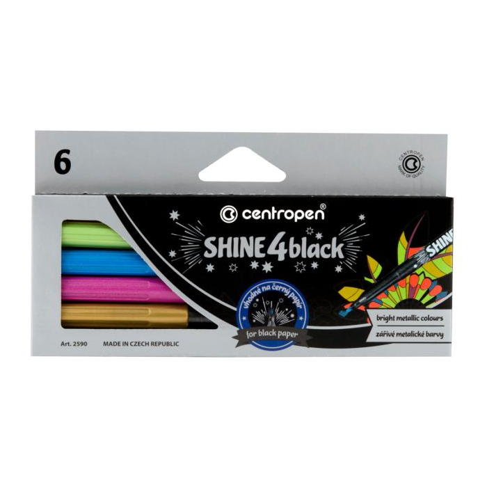 Metalické popisovače so sýtymi atramentmi. Ideálne na vyfarbovanie jemných detailov. Vhodné na použitie na tmavom papieri. Ventilačný uzáver. ERGO držanie. 6 farieb (modrá, zlatá, zelená, červená, ružová, strieborná).