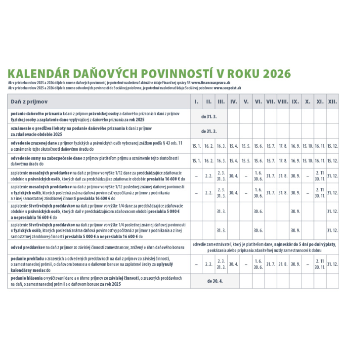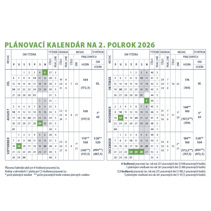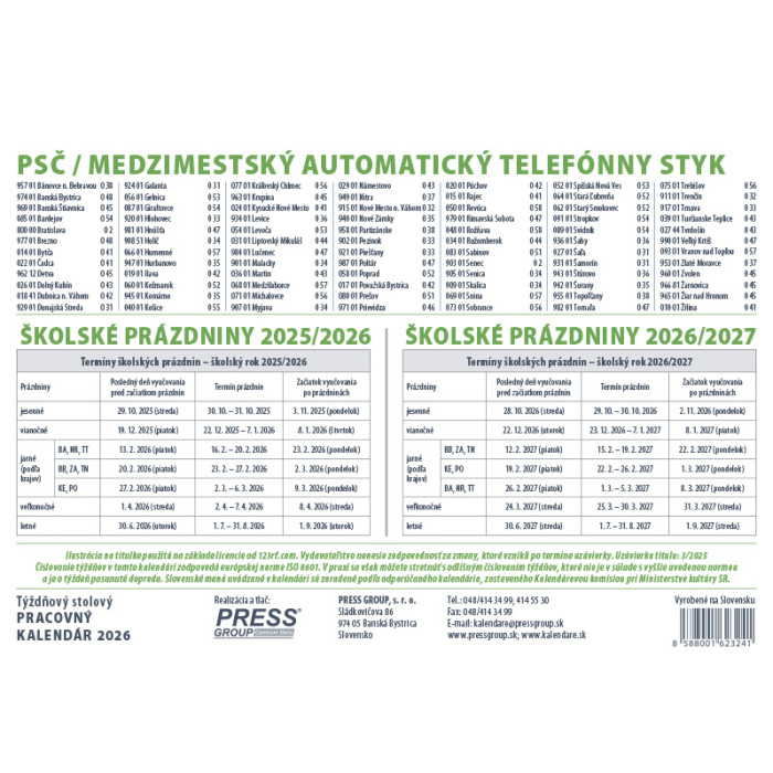 Variant pracovného kalendára s riadkovým kalendáriom. Obsah je identický s veľkým pracovným kalendárom, vrátane daňových pripomienok s prehľadnými mesačnými kalendáriami, fázami Mesiaca, východmi a západmi Slnka, štátnymi sviatkami všetkých krajín EÚ, školskými prázdninami, znameniami zverokruhu, slovenskými a českými menami (plus netradičné mená).